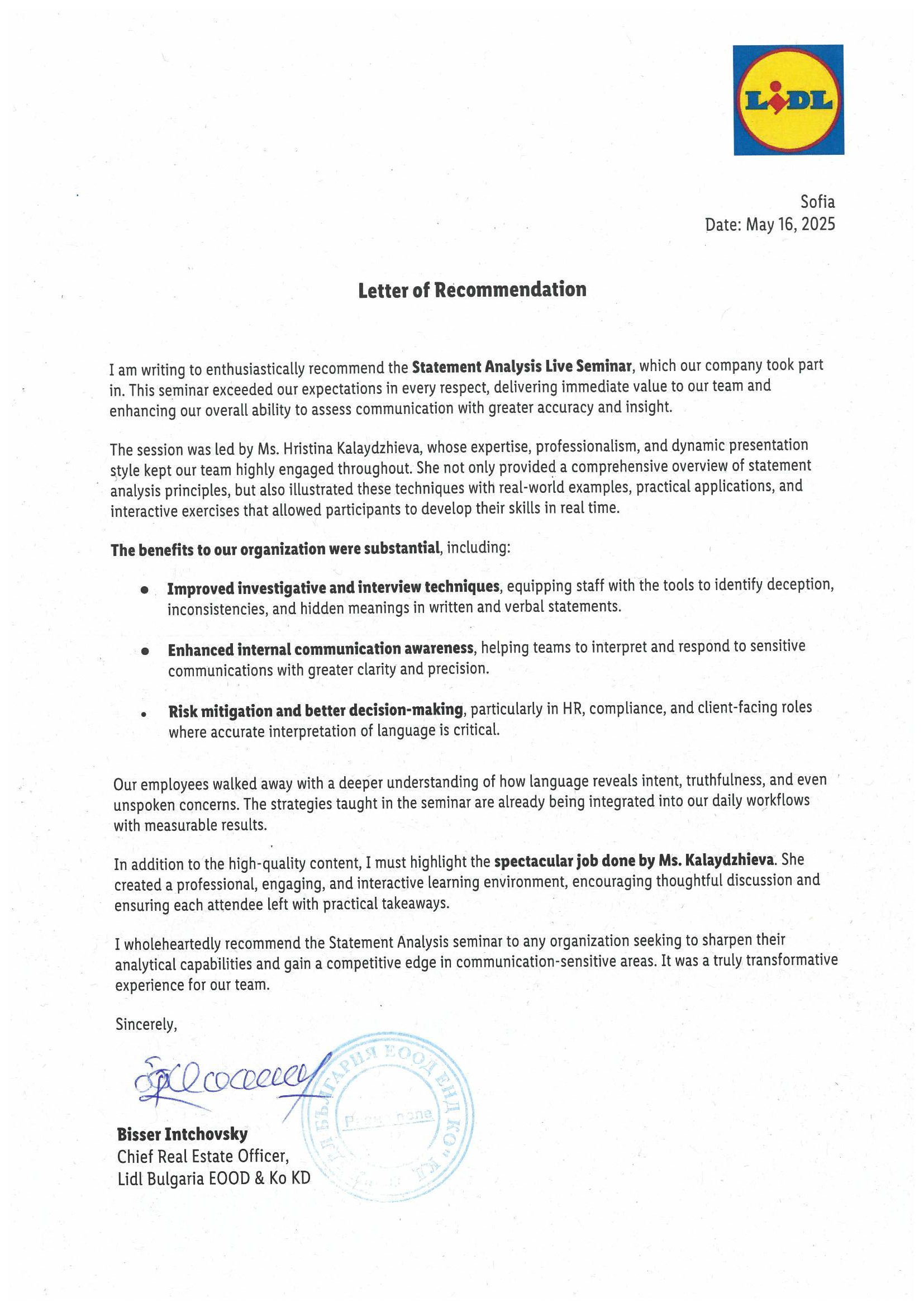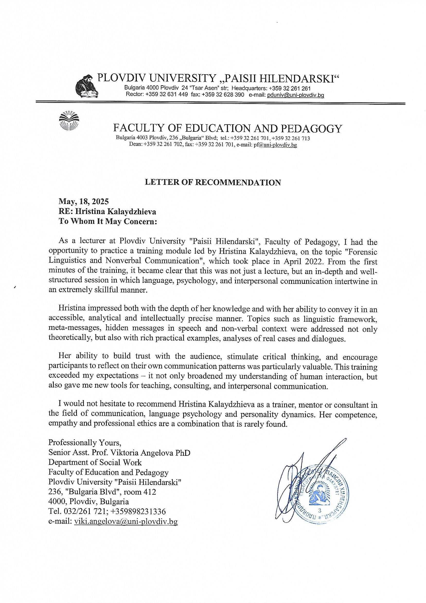 She has collaborated with numerous institutions and organizations in Bulgaria, including the National Institute of Justice, Ministry of Internal Affairs, Prosecutor’s Office of the Republic of Bulgaria, and the Ministry of Defence (with clearance). Hristina provides expert Statement Analysis services to both private clients and individuals domestically and abroad (see “Client Testimonials” section).