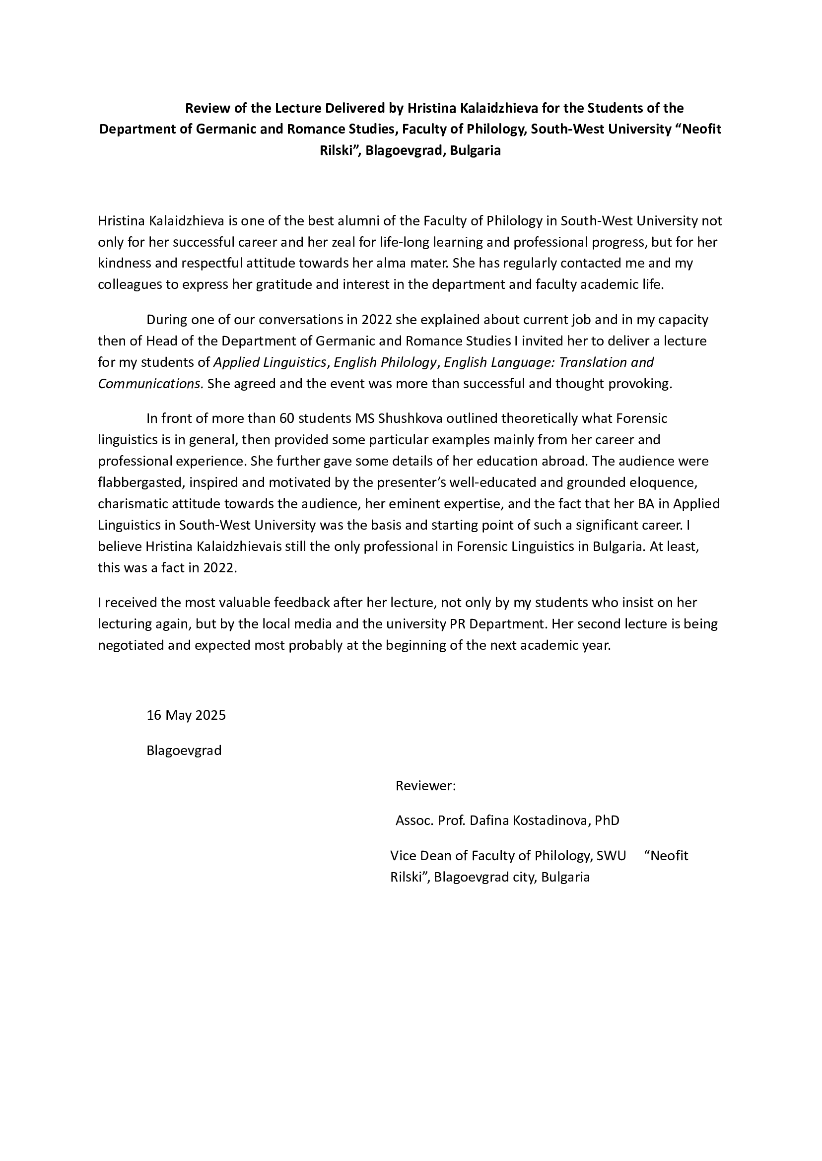 Hristina is a frequent guest lecturer at various academic institutions in Bulgaria, contributing to both undergraduate and postgraduate programs across linguistic and forensic disciplines.